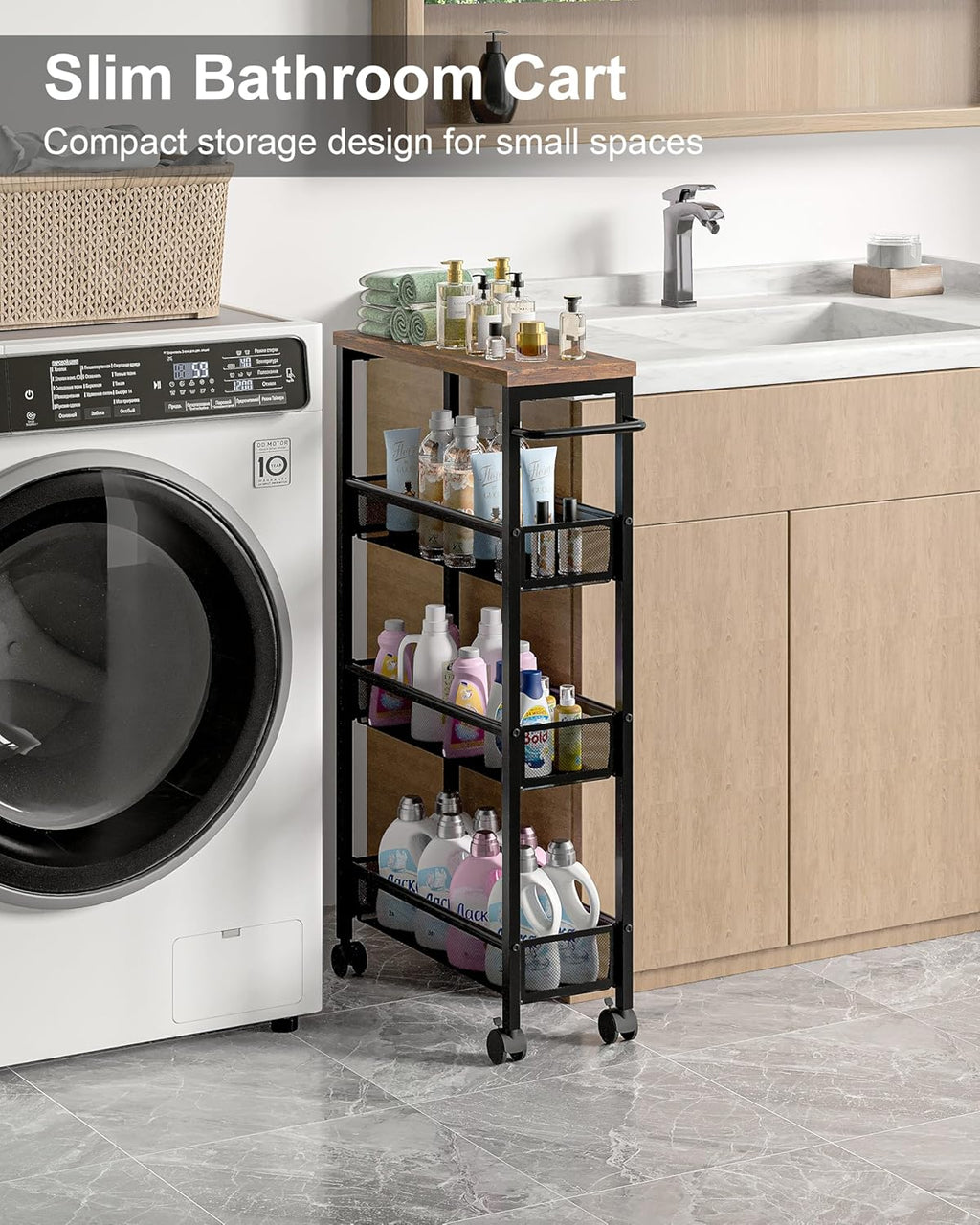• Ultimate Space Saver: This 17.9*7.1*34 inch slim rolling storage cart is designed for slim spaces, fit beside the fridge, washer or in cabinet gaps. Perfect gap filler for unused corners