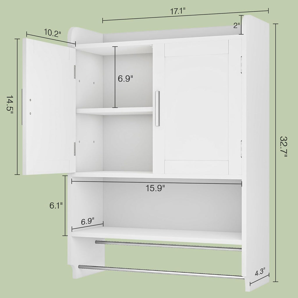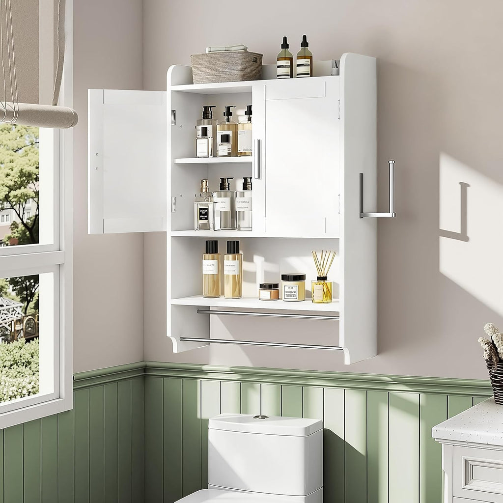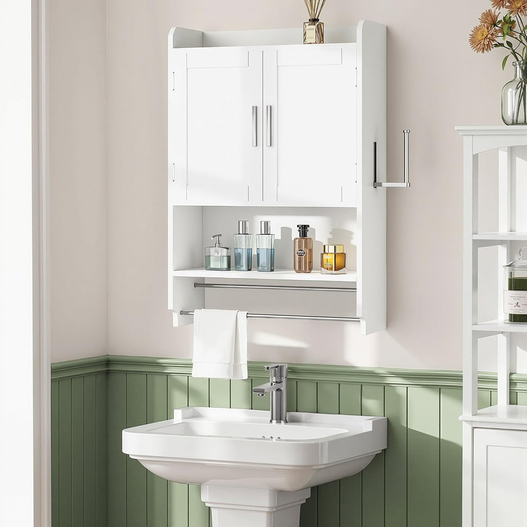 • 4 in-1 Multifunctional Design: VECELO bathroom wall cabinet with towels bar combines a top surface, bottom shelf, and towel rack in one. Its smart design meets various storage needs, enhancing space organization and functionality for more efficient use of space.