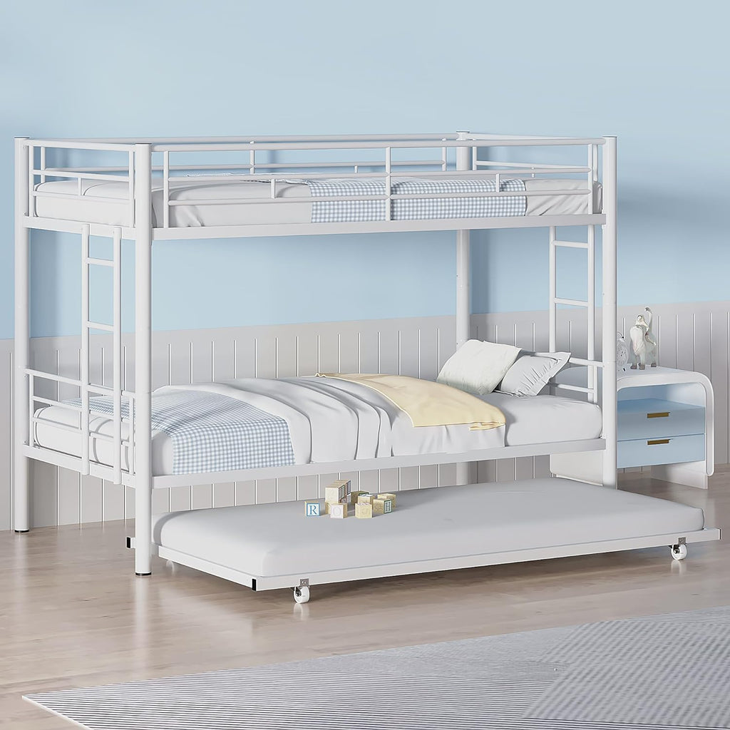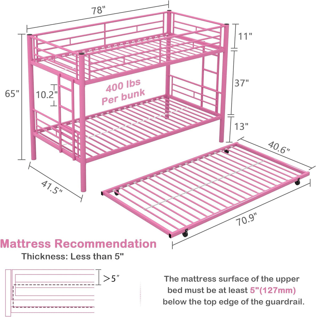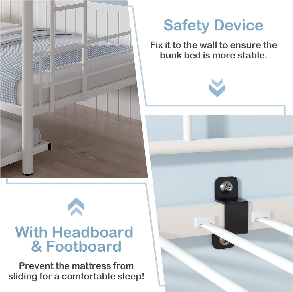 • [Sturdy & Stable] - Crafted from heavy-duty metal, this bunk bed with trundle is designed to provide long-lasting durability. With its 20 metal slats, this bunk bed twin over twin offers reliable support, guaranteeing a solid and sturdy structure. Extra ANTI-TIPPING accessories enhance stability and eliminate excess wobbling.