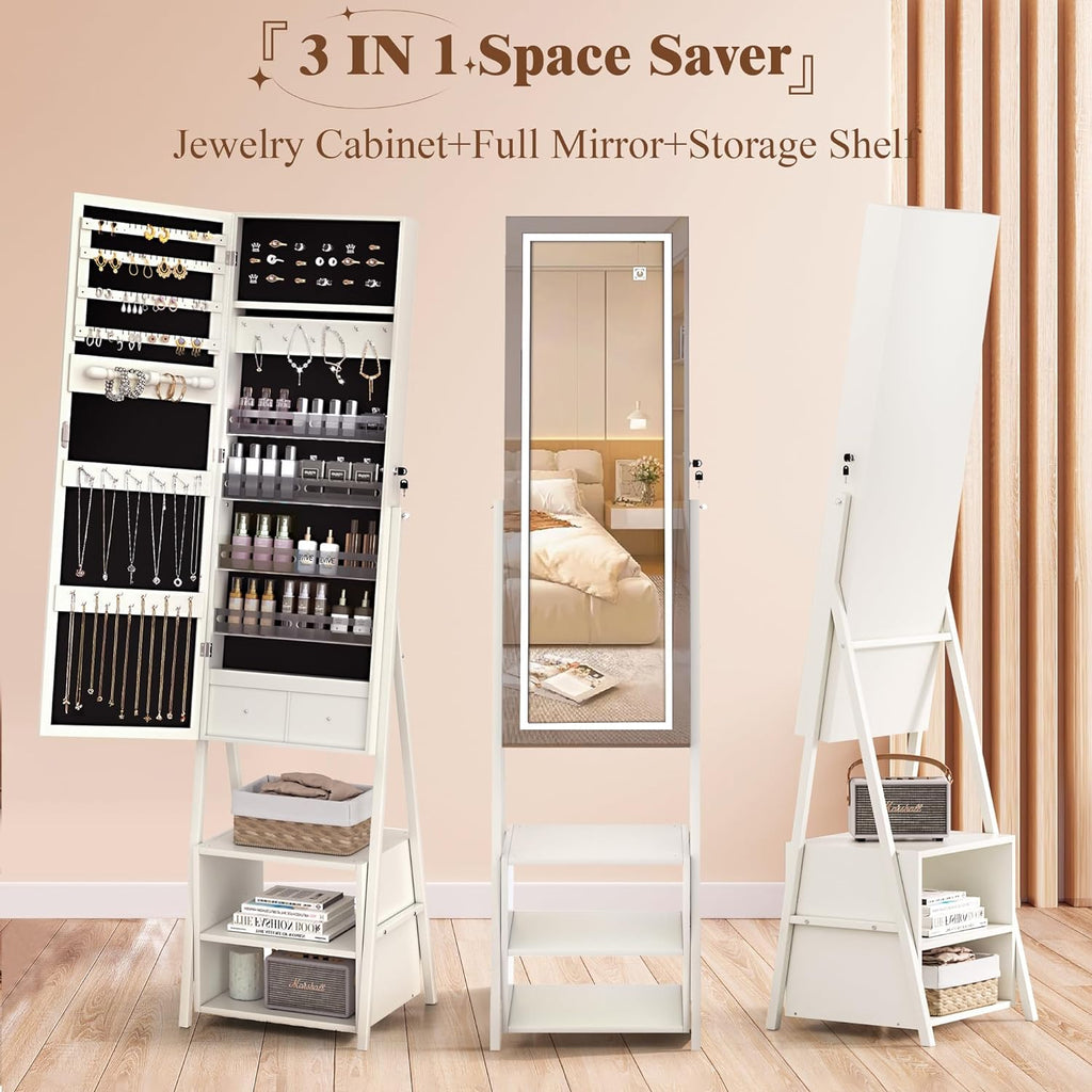 • 【Sophisticated Design】 :This freestanding jewelry cabinet boasts a modern, ivory finish, perfect for blending seamlessly with any decor style. The full-length mirror door allows you to view your entire outfit, while the interior offers a well-organized space to store all your treasured pieces.