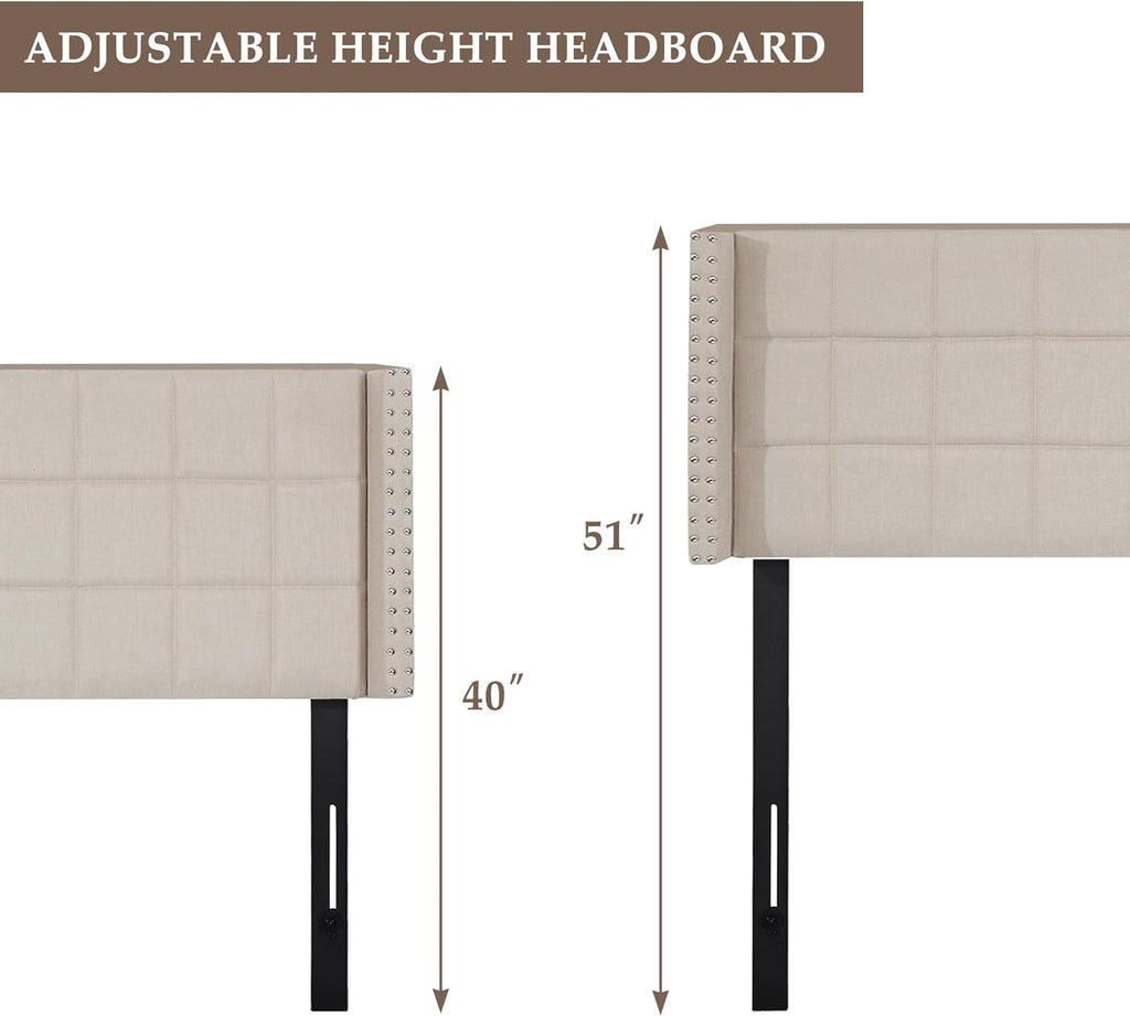 • Adjustable Headboard: The headboard is available in 6 optional adjustable heights. There are 2 sets of pre-drilled holes at the back, and 6 height-adjustable mounting positions from 40" to 49.8" in 3" increments, to fit most bed frames and bases.
