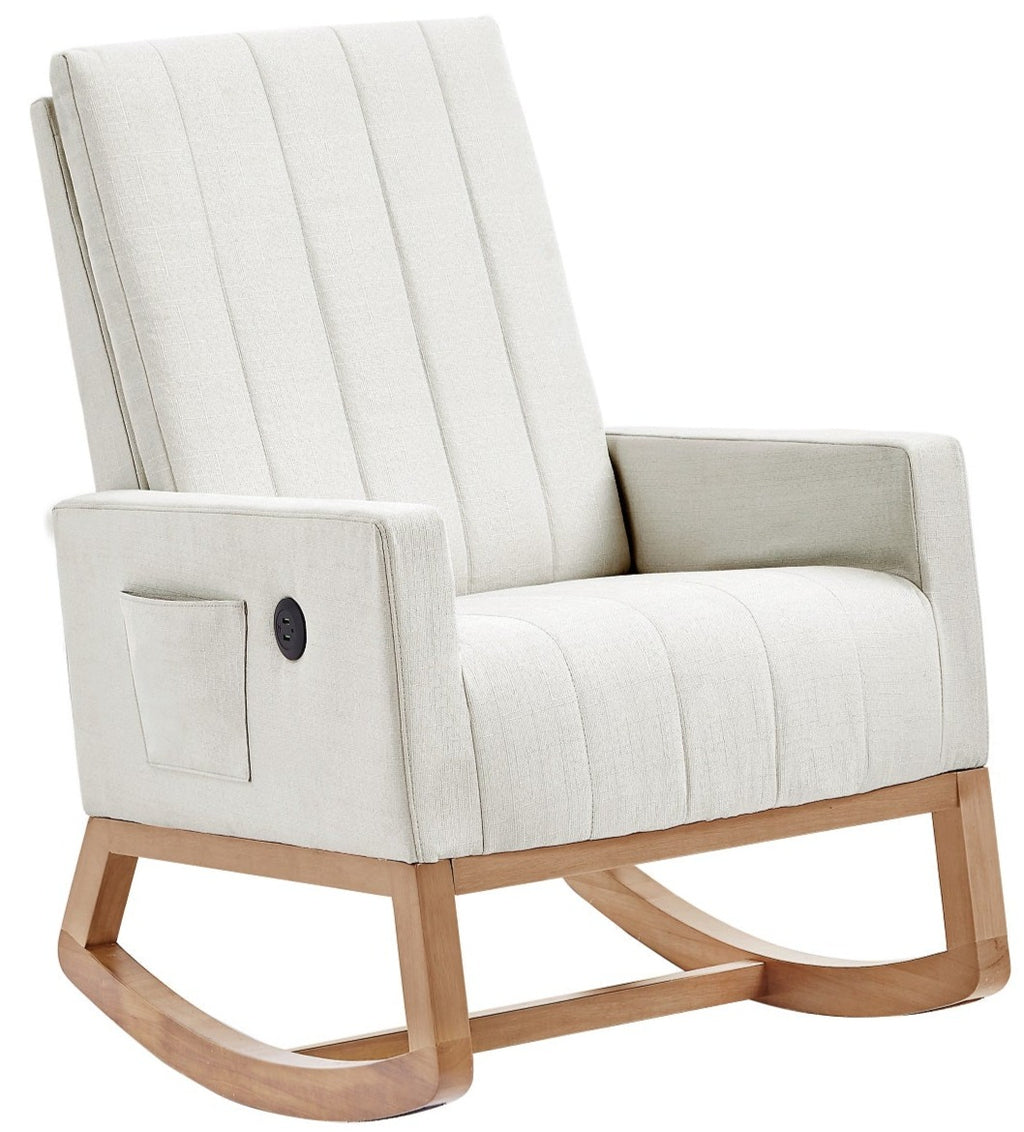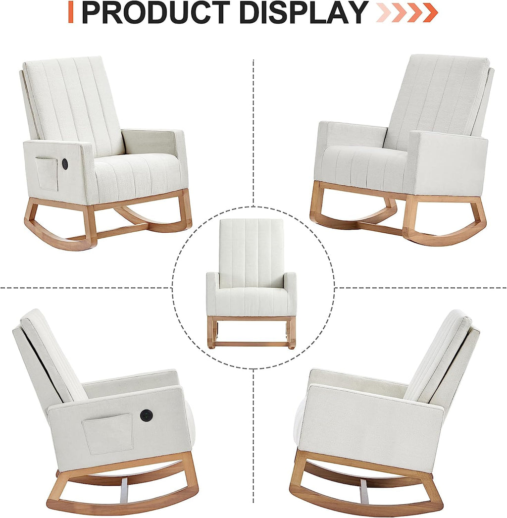 • 【Modern & Practical】Glider chair with high quality fabric, the surface is soft and easy to maintain. What's more, there is a pocket convenient for essentials like a remote or your favorite magazine, and there are also two USB ports that can easily charge your trusty electronics.