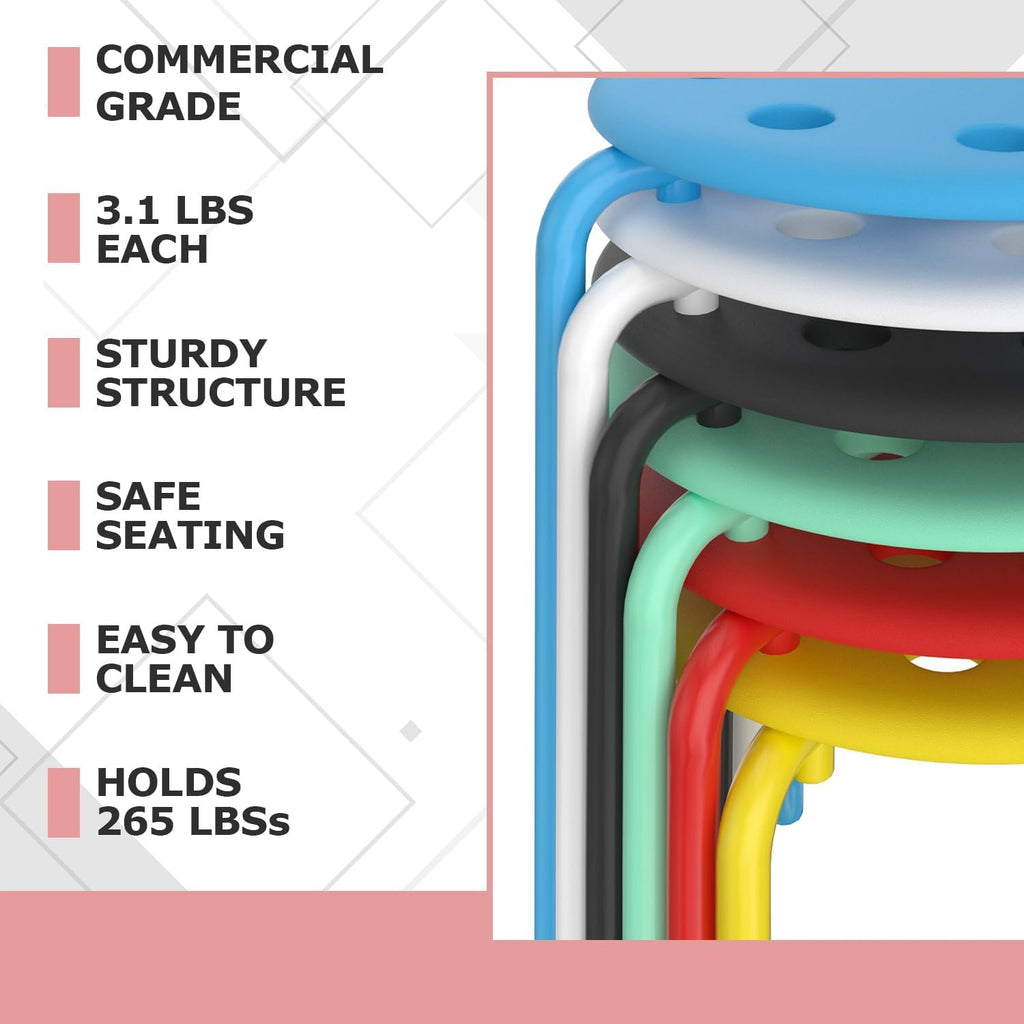• 【Commercial-Grade Quality】Colorful Stools made with easy-to-clean perforated plastic seats and durable powder coated steel frames that hold up to 265 lbs for years of heavy use and abuse.