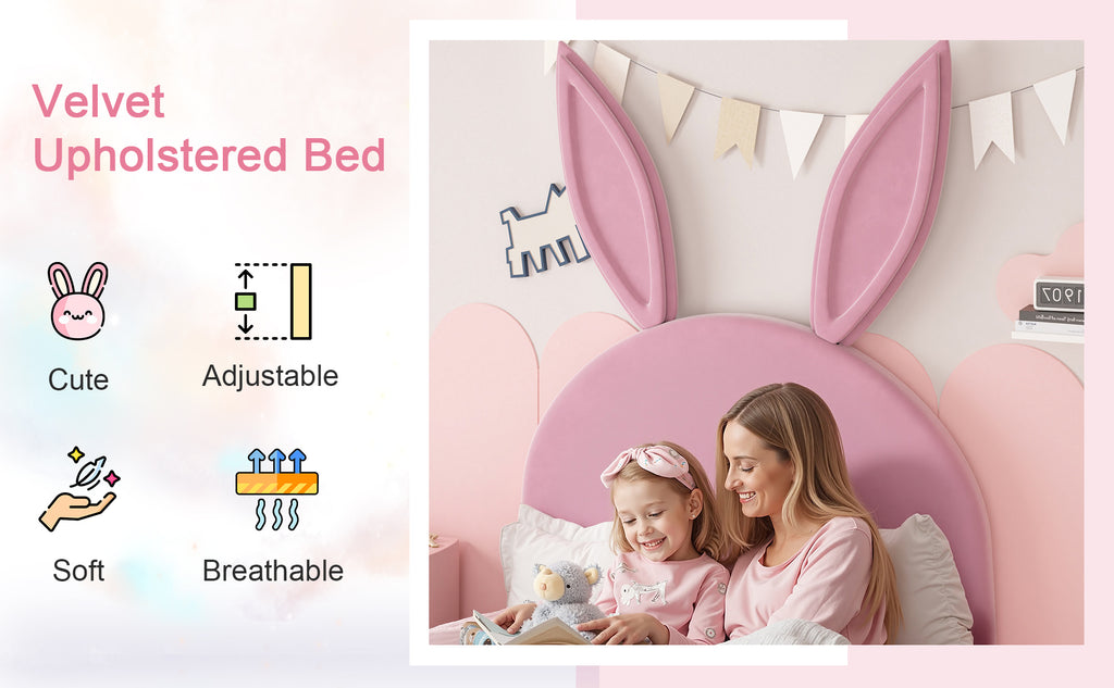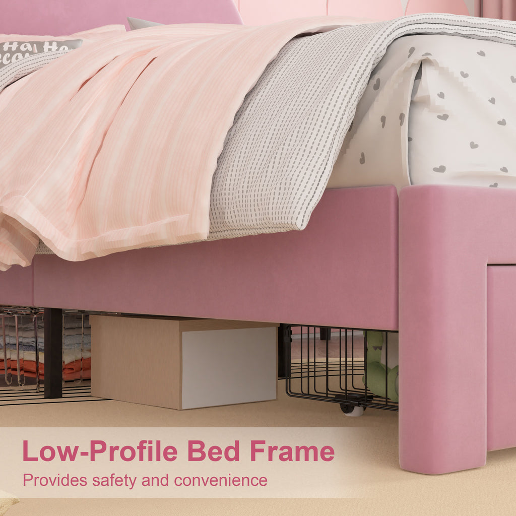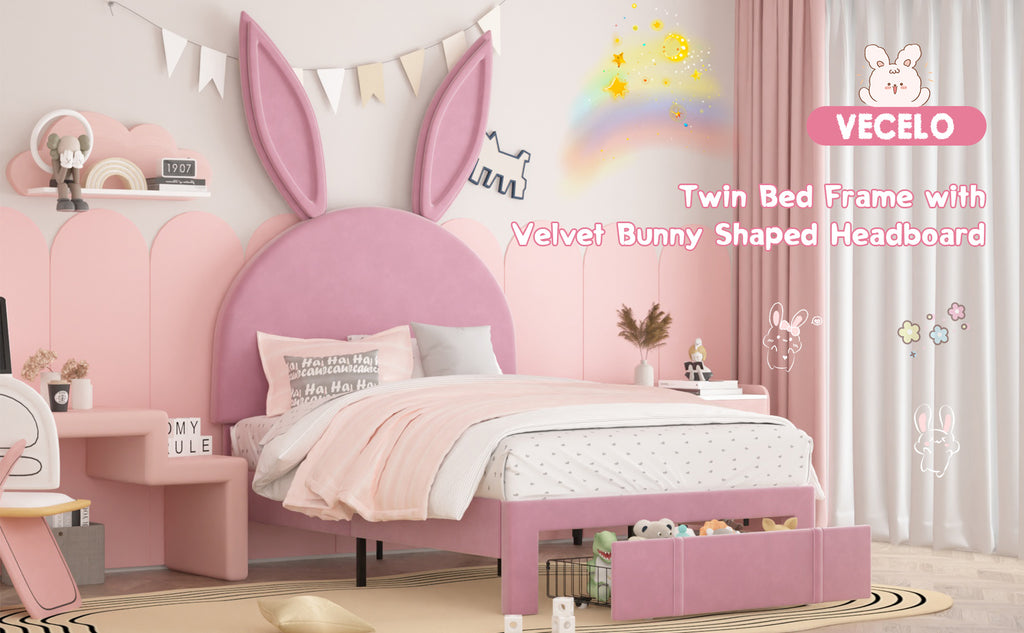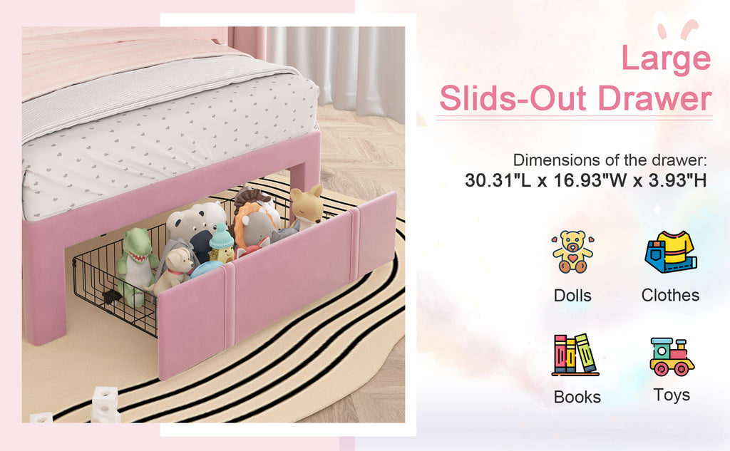 • Dream Princess Bed:This Twin Bed Frame with Storage is crafted with soft and skin-friendly velvet fabric, for a luxurious and elegant feeling. The design of the rabbit ear headboard filled sponge creates the perfect look that every kid will love. It offers exceptional softness and comfort when leaned against, ensuring a sweet dream for your little one.